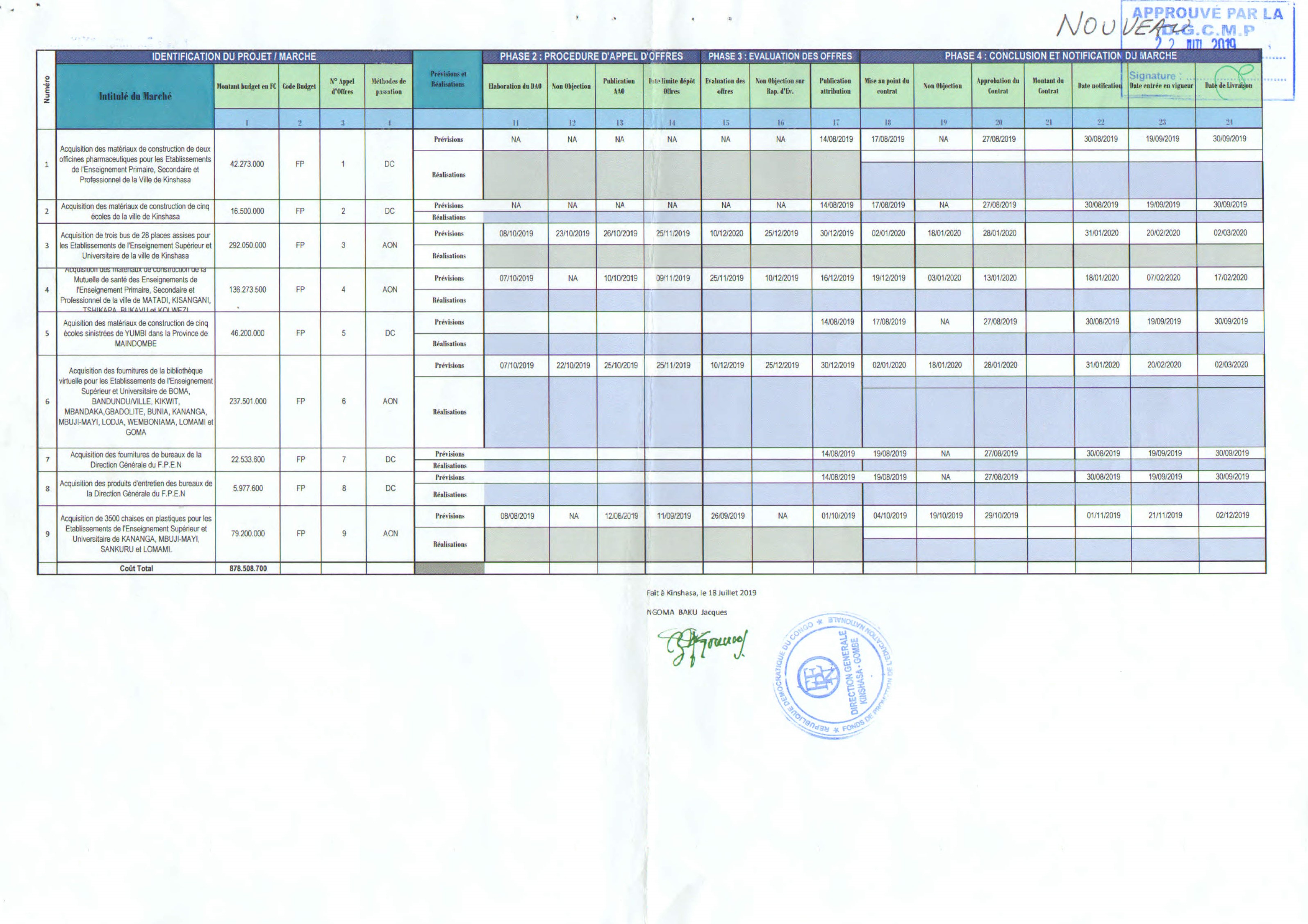 PLAN DE PASSATION DES MARCHES ADDITIONNEL 2019 DU FONDS DE PROMOTION DE L’EDUCATION NATIONALE/F.P.E.N.