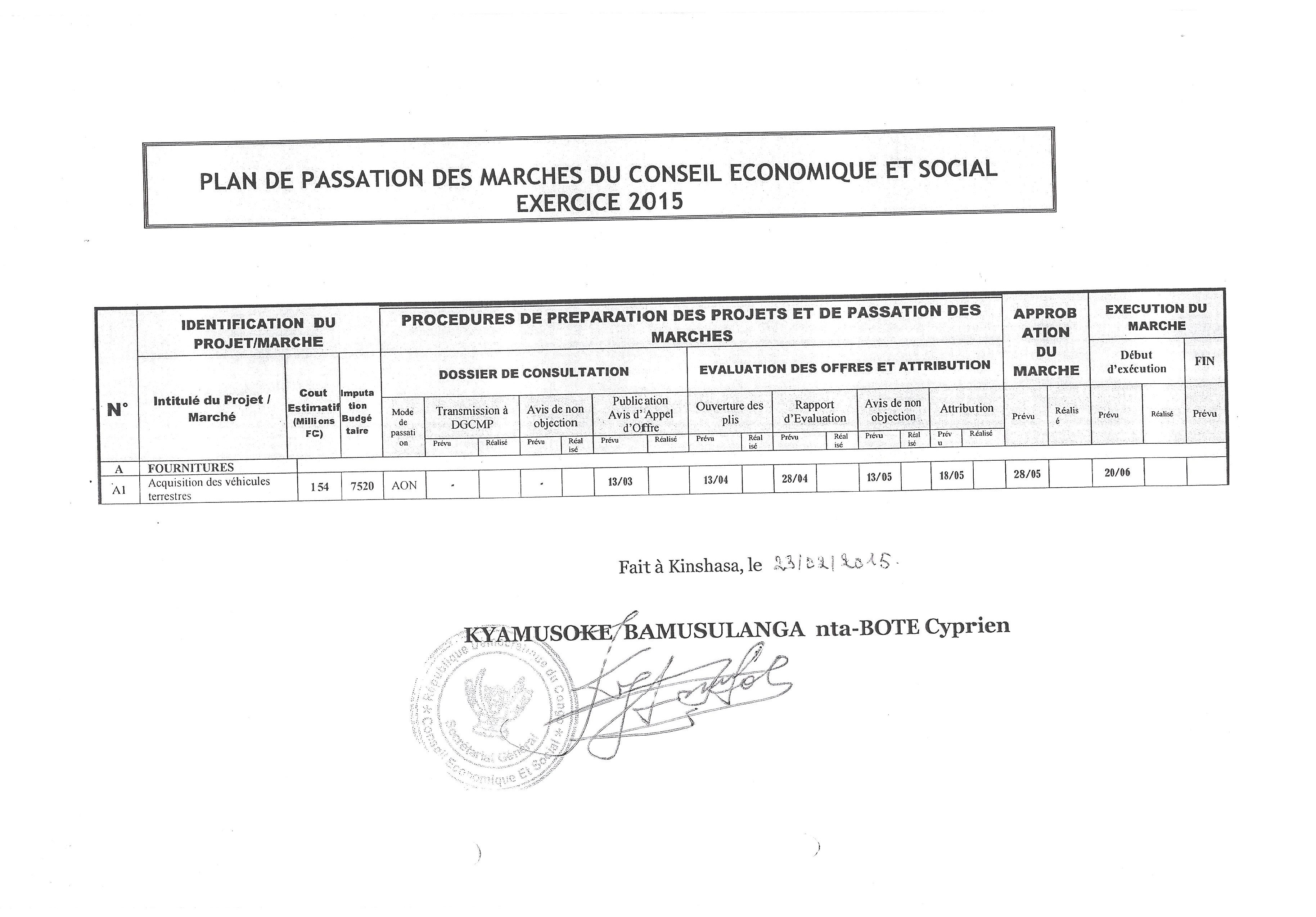 Plan de Passation des Marché du Conseil Economique et Social Exercice 2015